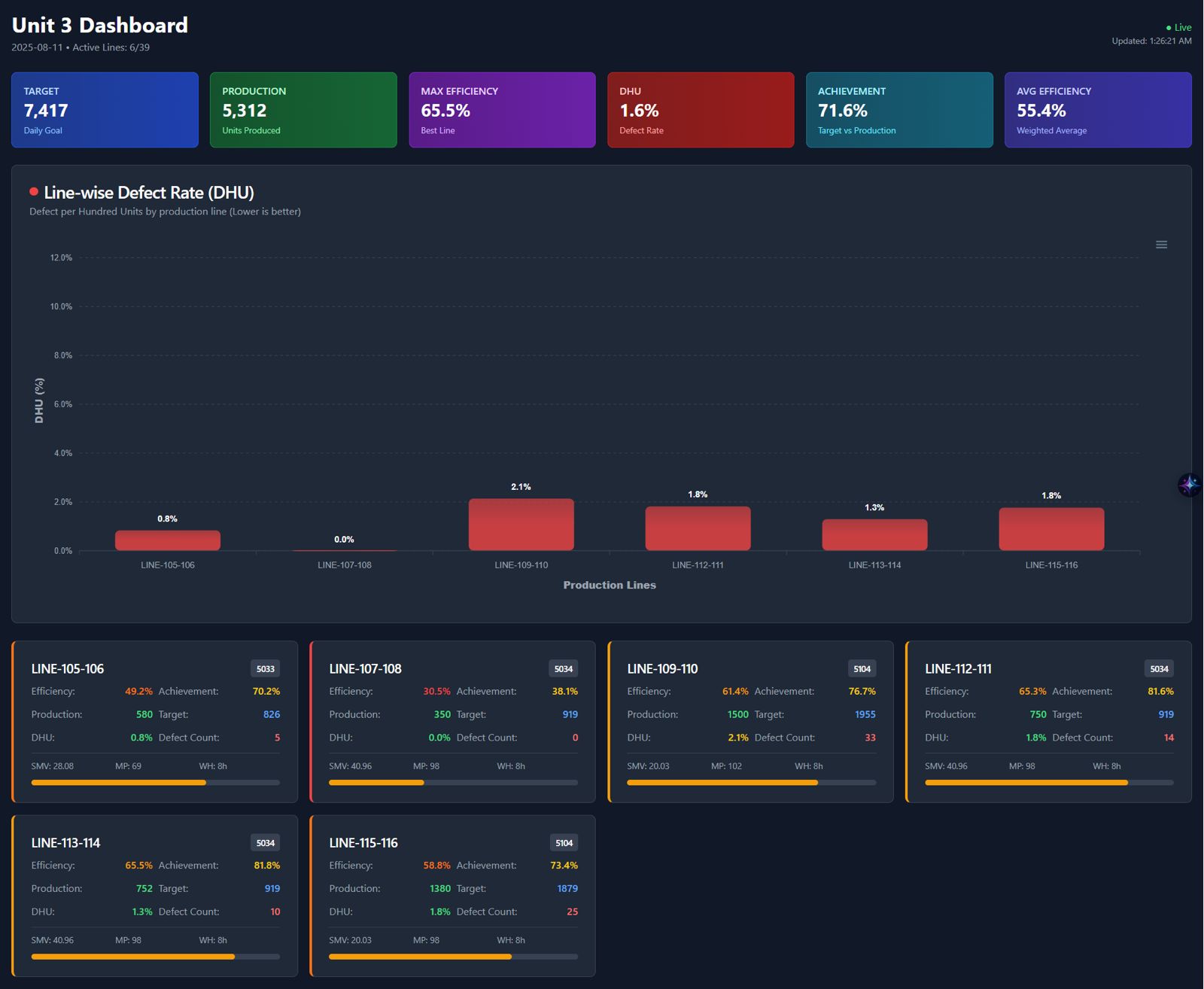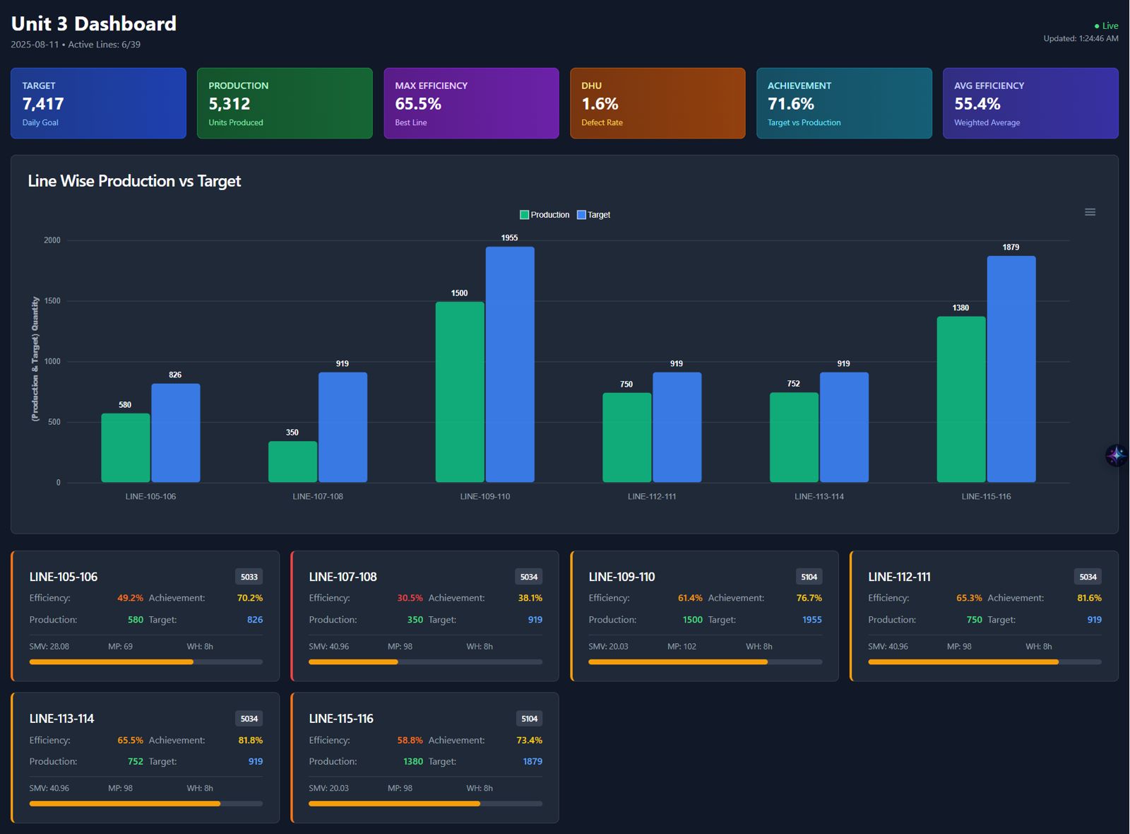 This component visualizes, for each machine, the target SMV, the actual average cycle time, and the efficiency percentage, helping you quickly see which machines are meeting or missing their cycle time targets.